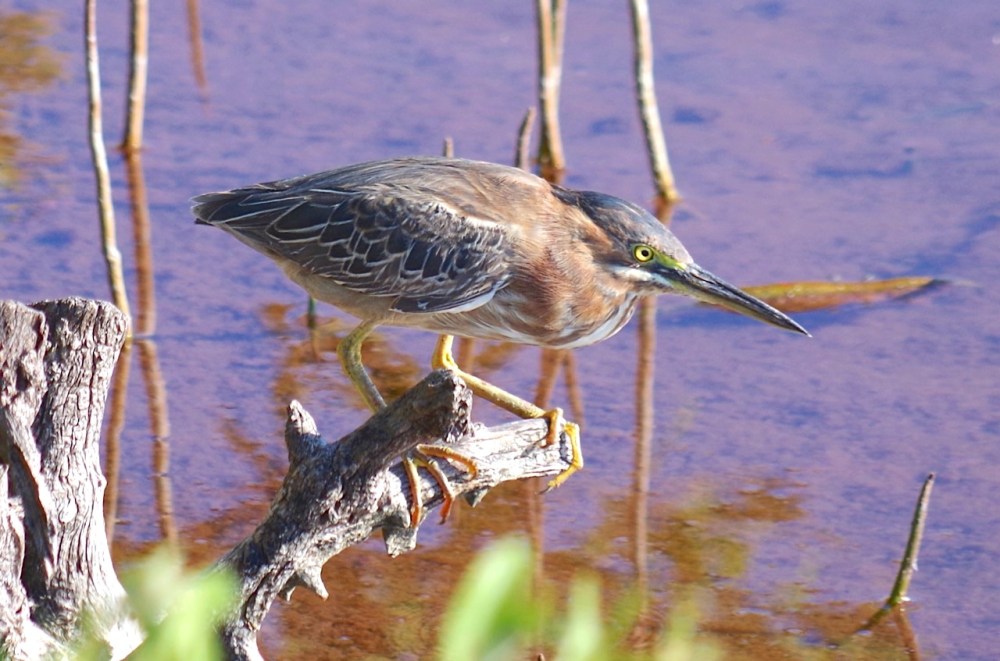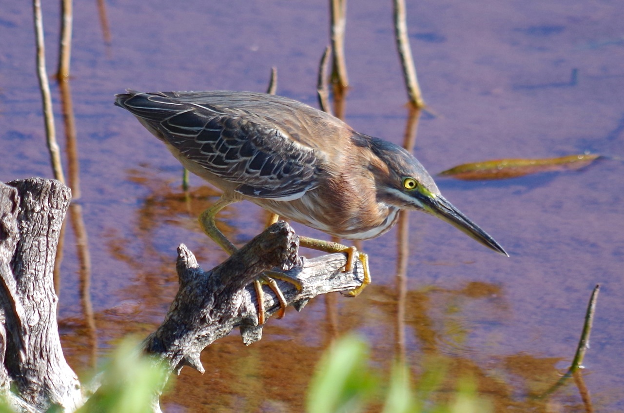 We found this small Green Heron quite easily. We’d watched it fly onto a stump in the pond near the jetty, then fly closer to the shoreline. By tiptoeing onto the jetty, we could see the bird perched close to the water, inspecting it with a fierce and predatory eye. Both eyes, in fact.