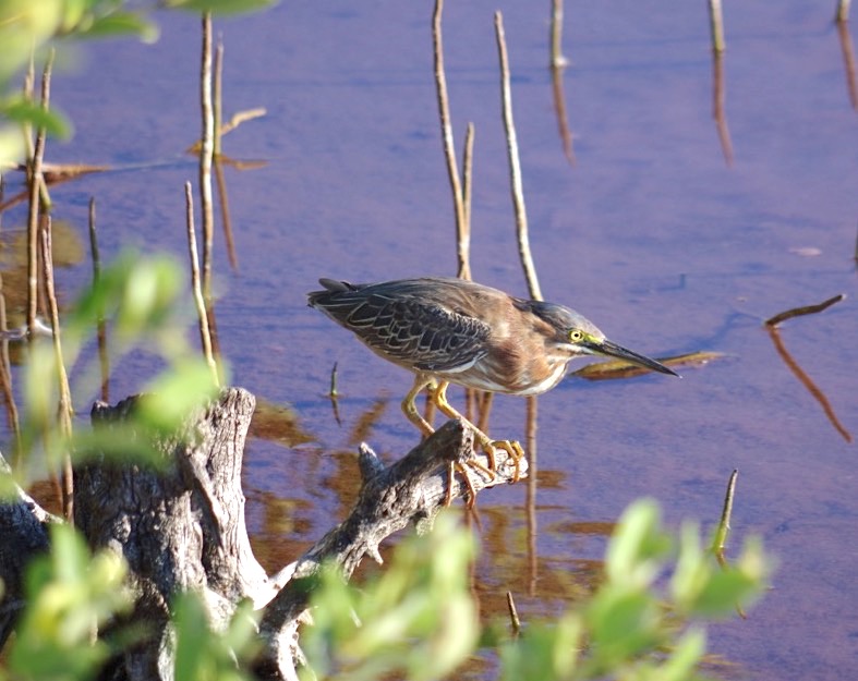 Green Herons are most likely to be seen in or near water – the margins of brackish ponds or amongst the mangroves, for example. Their foraging is mostly done in water, usually at dawn or dusk.