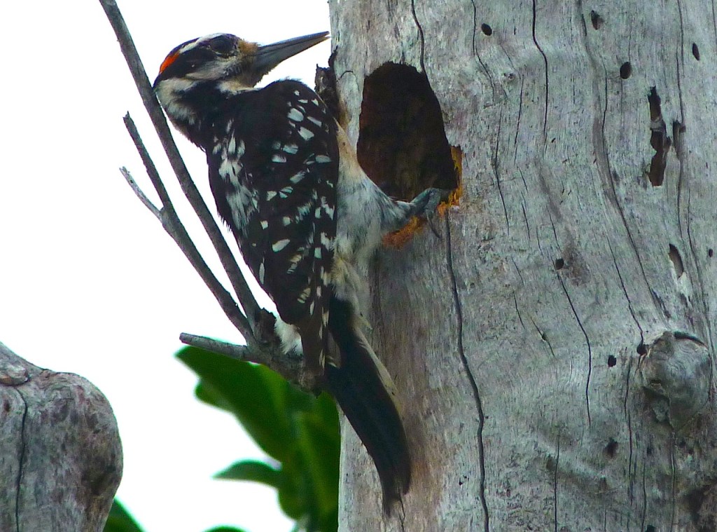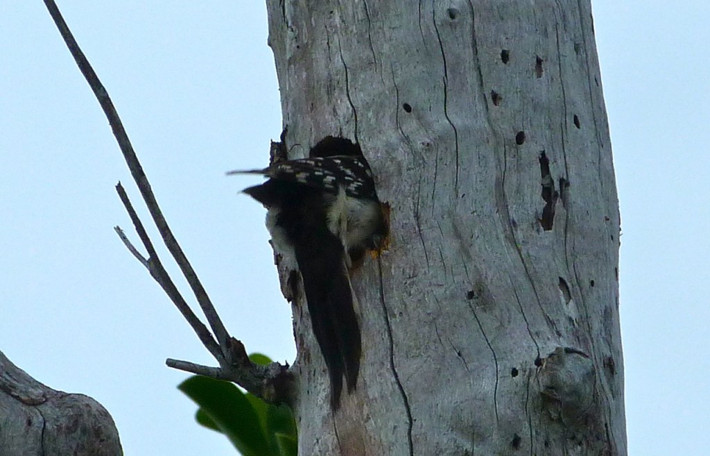 Last June Tom Sheley, a birding expert and photographer from Ohio with serious (by which I mean huge camo-covered camera and tripod) equipment, was staying at Delphi. He tipped me off about a woodpecker nest he’d found 1/3 of the way along the guest drive, just before the first bend. So I grabbed a camera – the wrong one, as it turned out, but my main camera battery was charging – and headed out. I found the nest at the top of a dead tree near the edge of the drive (shown above) and a female HW close to it.