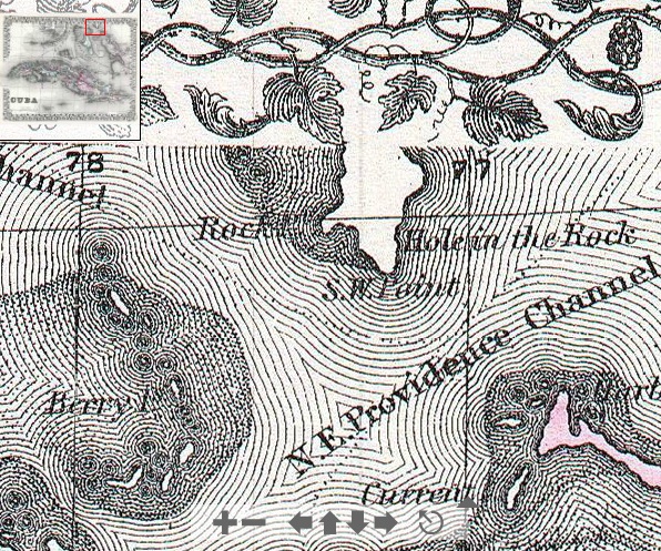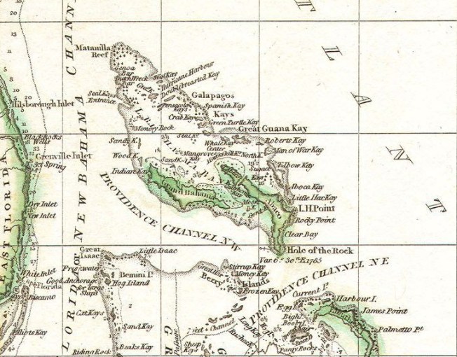 John Blair’s map of 1779, below, shows clearly ‘the Hole in the Rock’ – indeed, it is the only named place on Great Abaco. The southern end of Florida looks worryingly fragmented…