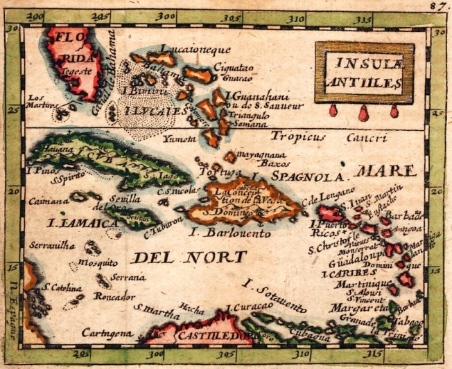 ADDENDUM I have now uncovered an even earlier and far more ambitious map published in 1550 by the Spanish cartographer Diego Gutiérrez. His incredibly intricate map, for the period, is decorated with volcanos, mermaids, monkeys, and variety of fantastical sea creatures. The first image is a detail of the whole map, showing the Bahamas, a sea monster, and a graphic shipwreck. I have also included an image of the whole map so that the extraordinary range and complexity of this early map can be seen in its entirety.