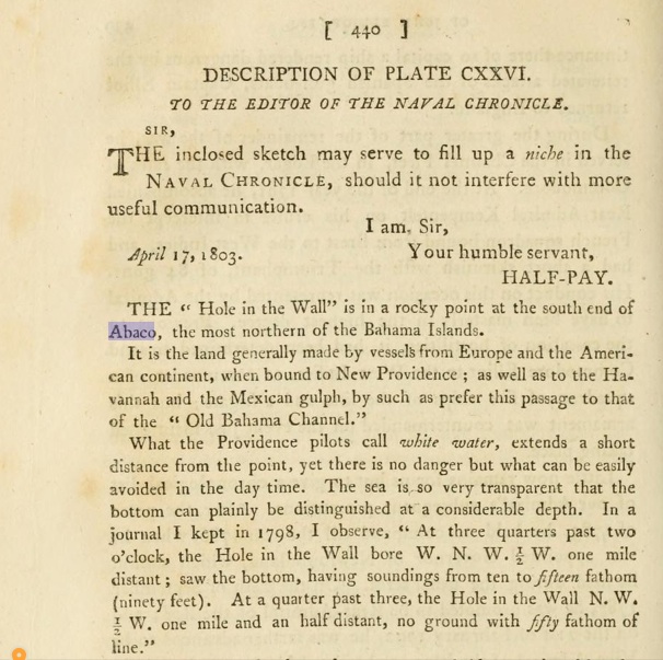 HOLE-IN-THE-WALL ABACO: HISTORIC 1803 DESCRIPTION & AQUATINT