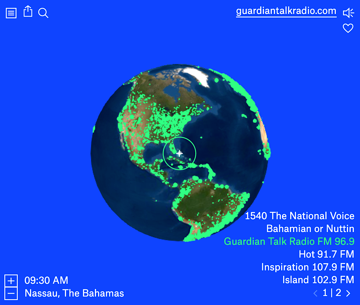 RADIO GARDEN – highly recommended for online or as App – a simple world-wide resource. The link is set take you direct to Guardian Talk Radio. You’ll see other Bahamas stations listed. Every green dot represents a radio station. The globe rotates. You can pinpoint a chosen station anywhere in the world in seconds