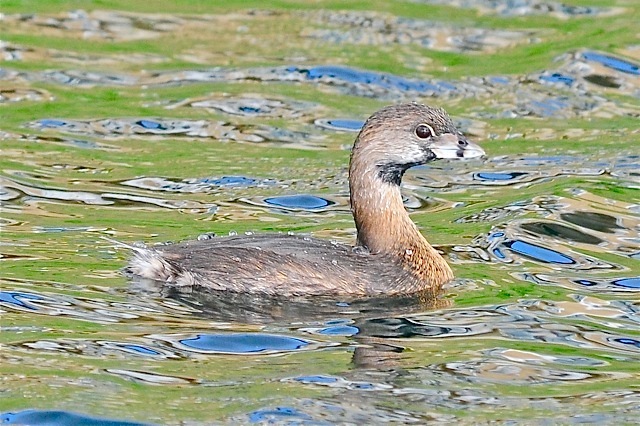 The pied-billed grebe is somewhat larger than the least grebe. In the breeding season, they have a distinctive black beak-ring. In the header image, the bird is just starting to acquire the ring. Their dark eyes also distinguish them from the golden-eyed least grebe; and their beaks are pale rather than dark.