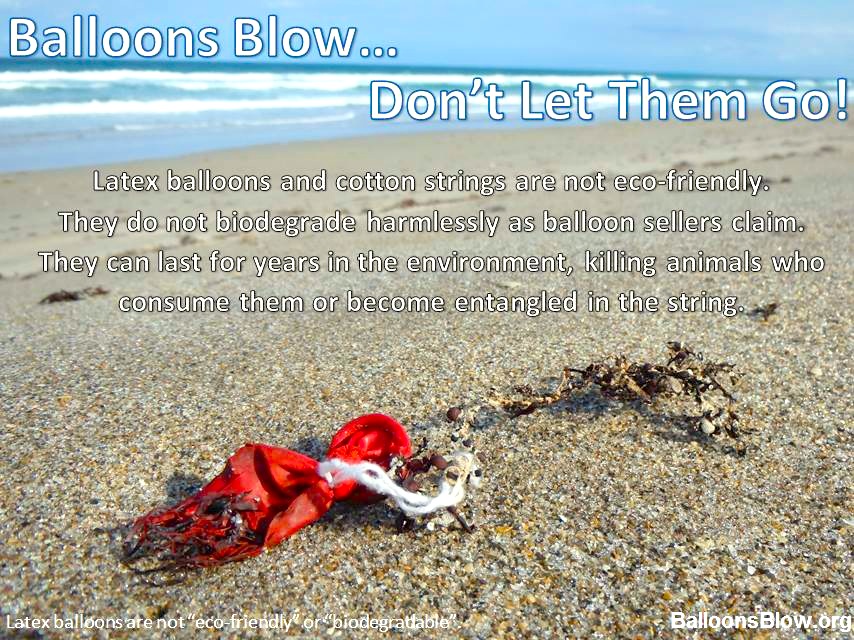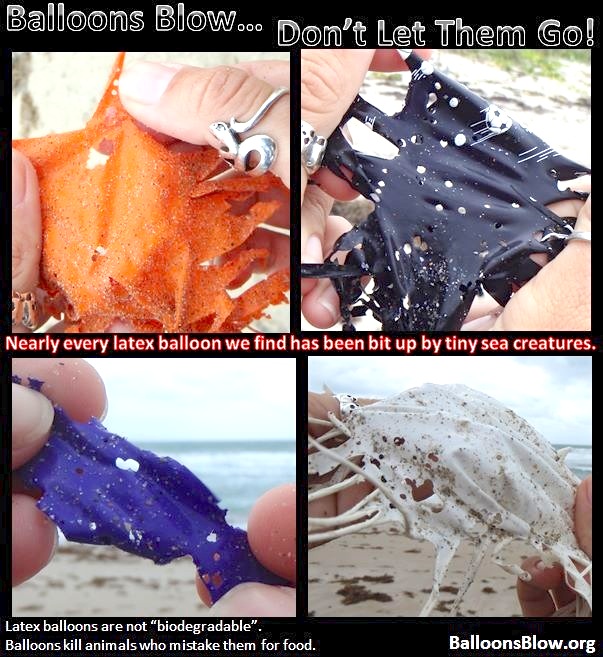This post has concentrated on the dangers to wildlife caused by latex and mylar balloons that are sometimes claimed to be biodegradable but are not. There’s more to be said about plastic marine trash, but I’ll keep that for another day.