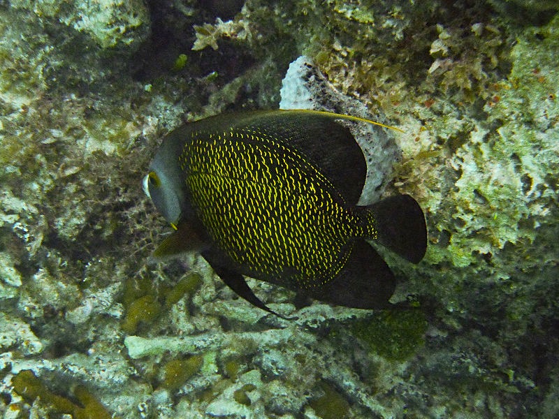 I recently posted about the highly colouredQUEEN ANGELFISH, a striking coral reef resident glowing with fluorescent blues and yellows. It’s the Angelfish that went into showbiz and succeeded. Its close cousin the Gray Angelfish is a more sedate creature, with the appearance of a professional – law, possibly, or medicine. That thin blue fin-edging suggests a flamboyant streak. Slightly mean mouth? Lawyer.**