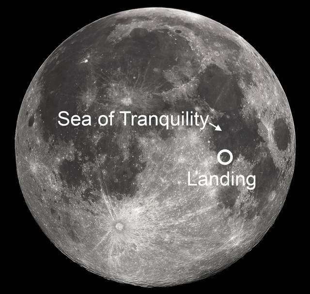 This led me on to thoughts of the moon landings, and in particular Apollo 11. Wasn’t there something about touching down in the Sea of Tranquility? But whereabouts exactly on the supermoon? Here’s the answer. The moon below (from SOERFM) is at a different angle, but it can still be compared with the supermoons above.