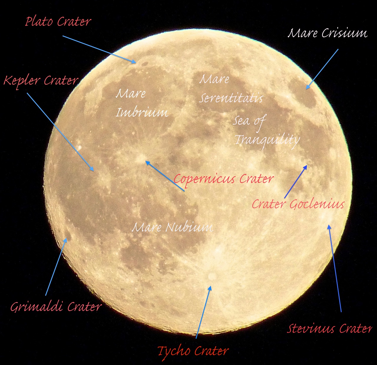 Then I got to wondering what exactly I was looking at. I had a vague memory of some of the seas – Mare Imbrium for example – but I couldn’t remember any crater names at all. So I did a bit of research in an amateur serenographist kind of way and came up with this:
