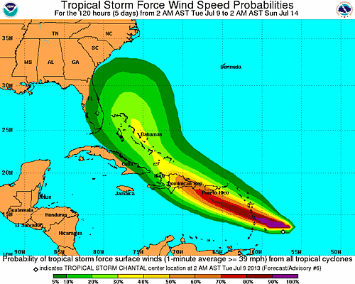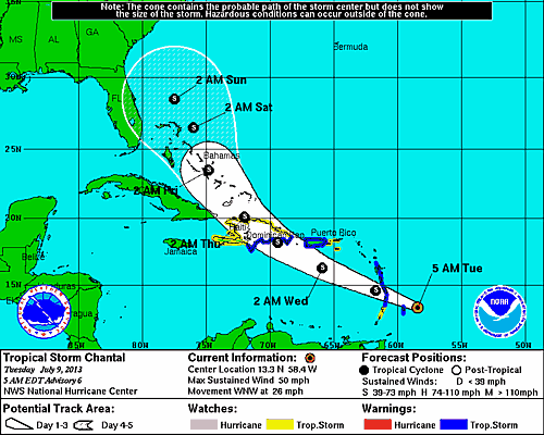 The 9th July, the season of storms starts to loom, and Chantal is first off the meteorological starting blocks. The reason I am posting this now is because the present 5-day predictions (see NOAA charts below) has Chantal heading directly for the Bahamas in general, and Abaco in particular. So this may be one to keep a weather eye on over the next few days…