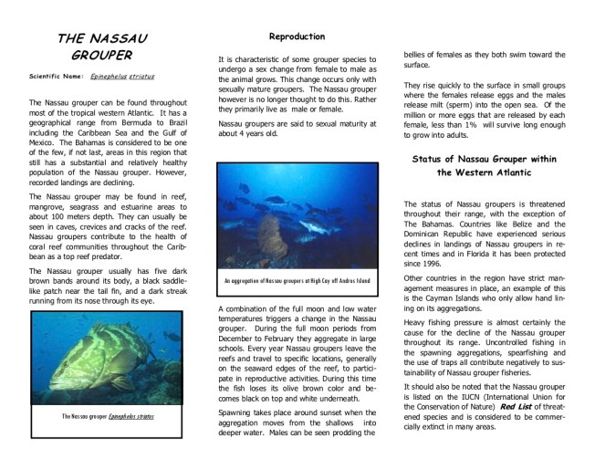 The Nassau grouper Epinephelus striatus is just one of a number of grouper species that inhabit Bahamian waters. They are mostly found in the Northern Bahamas but only the Nassau grouper is on the IUCN Red List as an Endangered Species in need of protection.