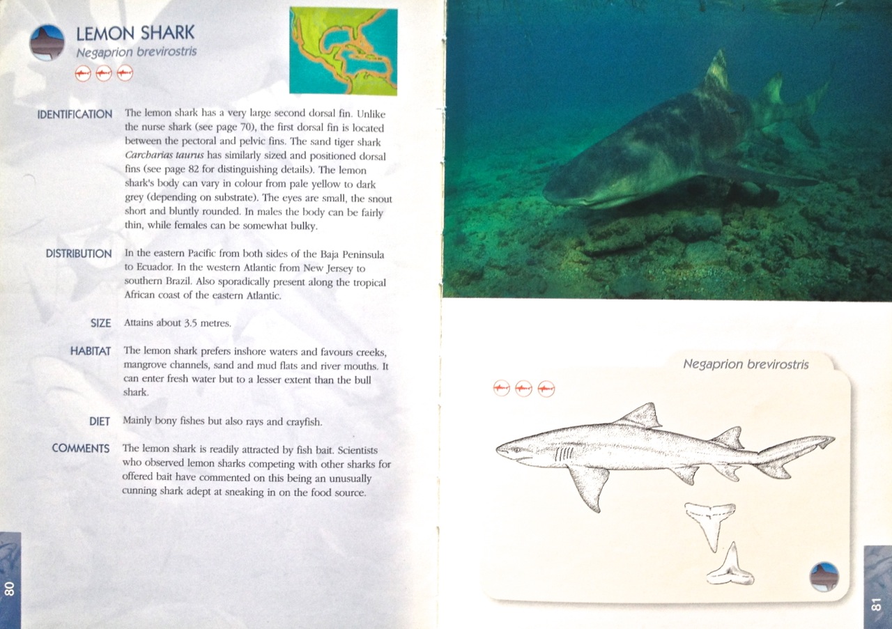 The entries for the Blacktip Shark and the Lemon Shark. Each entry features a useful range map, and an even more useful ‘potential danger rating’ for each species. It’s worth remembering, however, that there are sharks worldwide, and they all have teeth. Thousands of people dive and swim with many of the species every day in complete safety. There are simply some does and don’ts, mostly completely obvious, that will make the difference between enjoying their company (and they, yours); and pushing your luck with a wild creature when you have intruded into its habitat…