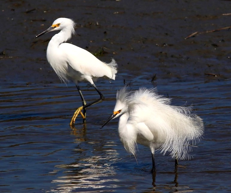 Well, what’s all the fuss about here? One snowy egret is striding confidently forward. The other has gone into full-scale feather-frenzy melt-down. Something is clearly up…