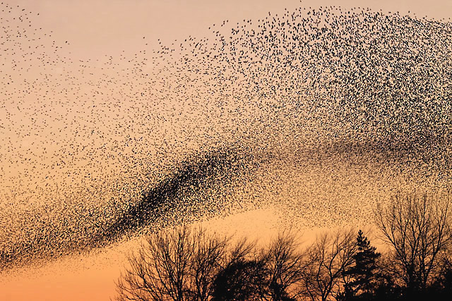 In the UK in late autumn, starlings start to gather in huge flocks in trees and open fields. Twitchers begin to gather too, in their all-weather plumage, ready to watch the sensational avian displays of thousands and thousands of starlings as they take to the air almost simultaneously. They swirl in densely packed random formation, drawing complex patterns across the sky. The group will constantly change direction and height, sometimes splitting into subgroups and reforming. They may suddenly drop to the ground in a teeming raucous mass, before taking off again to continue the display.