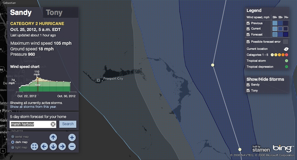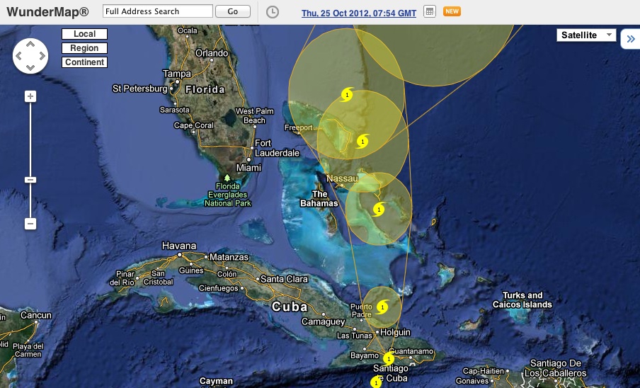 The latest maps below show TS / Hurricane Sandy at 5 am EDT today. Map 3 is the most useful for the current detailed Abaco prediction. Meanwhile, the US news indicates increasing concerns further north (much as happened with Irene last year)