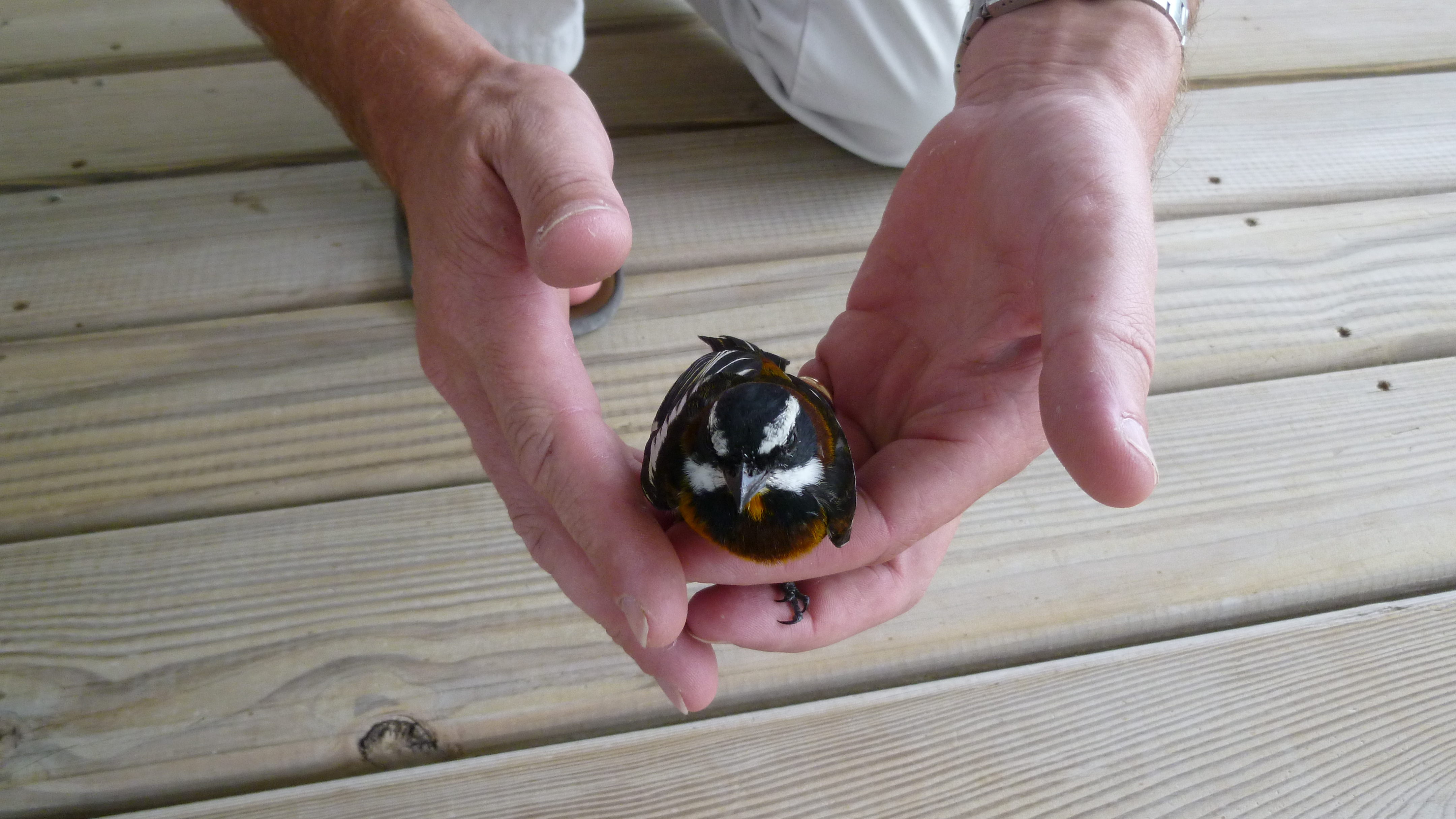 You’ll see that this male bird’s hunched posture has produced a rather impressive neck ruff, an adornment presumably irresistible to female spindalises. Both birds were ‘chucking’ softly to each other, and the male turned his head regularly to show off his glories from all angles.