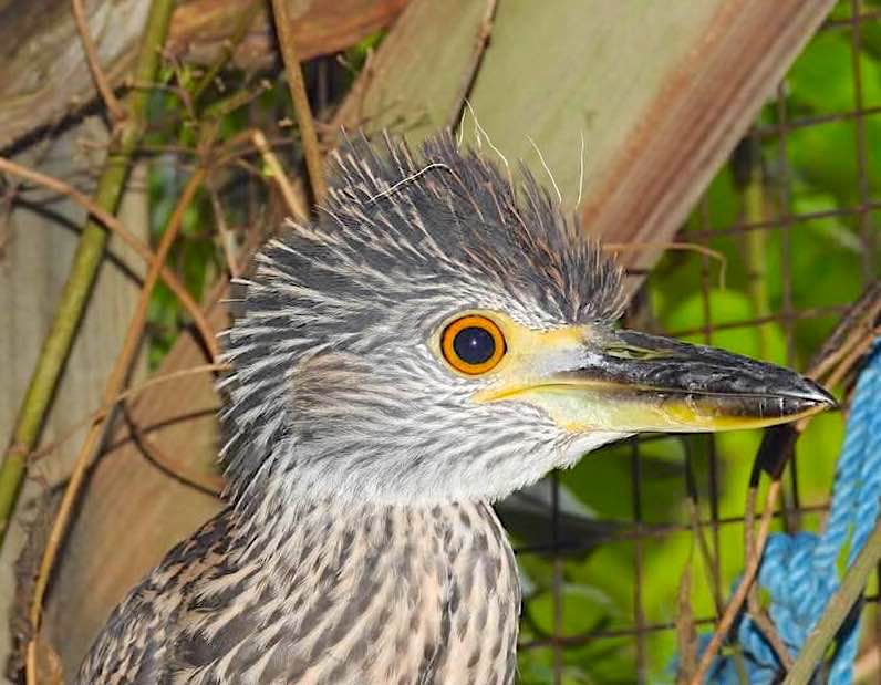 Admiring birds, photographing them, and counting them for surveys – all these are excellent pastimes. But for a real and meaningful interaction, there can surely be nothing more rewarding than animal rescue. Melissa Maura, known I’m sure to many readers of this blog, is an expert at caring for damaged or orphaned creatures. And at the beginning of June, she took a small dishevelled YELLOW-CROWNED NIGHT HERON into her care for rehabilitation. He was named Big Bird.
